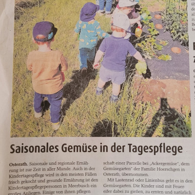 Im Sommer 2022 habe ich gemeinsam mit meiner Kollegin Angelika Schumann eine Gartenparzelle bei "Ackergemüse" übernommen. Hier pflanzen, pflegen, wässern und ernten wir gemeinsam mit den Kindern unser frisches Gemüse. Die Kinder sind mit Feuereifer dabei. Auch im Jahr 2023 werden wir wieder eine Parzelle mieten und jetzt auch Pflanzen aussäen, damit die Kinder die Entwicklung vom Samenkorn bis zum erntereifen Gemüse miterleben können.